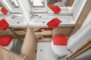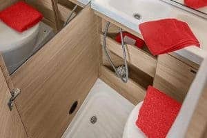 - Kompaktbad mit Dusche, Waschbecken und drehbarer Kasettentoilette