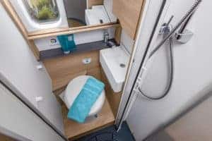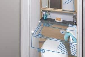 - Raumbad oder Kompaktbad mit Waschbecken, Dusche und drehbarer Kasettentoilette