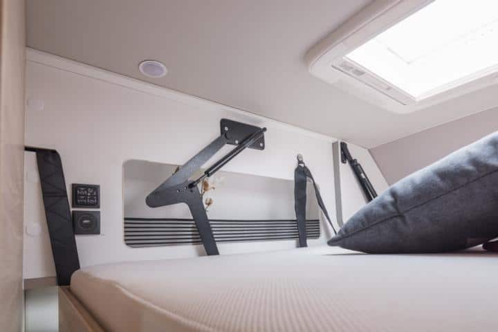 Der Boxstar 600 Solution lässt sich spielend vom Tag- in den Nachtbetrieb umwandeln. Der Moon-Camper Boxstar 600 Solution verfügt über ein großes Doppelbett (194×145) und ein Hubbett im Bug (176×130).