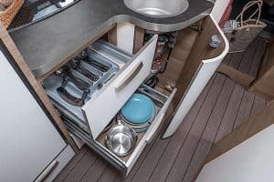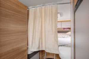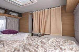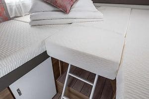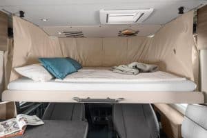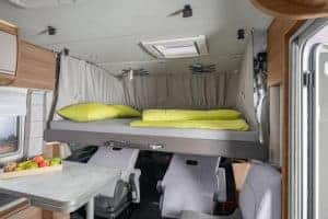 Der Live I lässt sich spielend vom Tag- in den Nachtbetrieb umwandeln. Der Moon-Camper Live I verfügt über ein großes Doppelbett im Heck mit 2 Einzelschlafplätze in der Größe 198x81cm und 193x81cm. Dieses lässt sich durch einfachen Umbau in eine große Liegewiese umbauen. Zusätzlich gibt es ein großzügiges Hubbett (195×150 cm) im Bug.