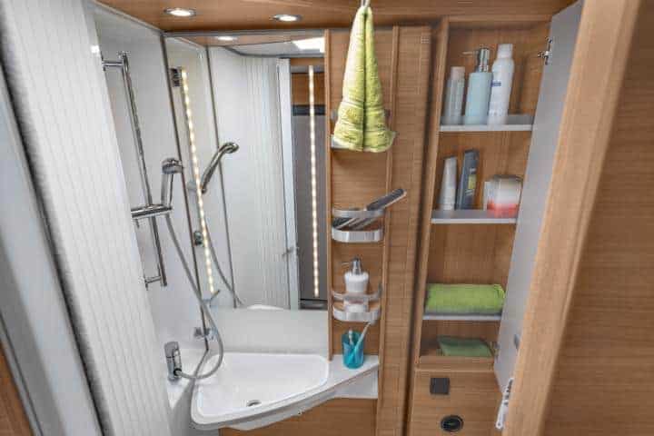 Ob in den Heck‐Einzelbetten, die sich spielend in eine große Liegewiese umbauen lassen oder im großzügigen Hubbett, das sich besonders weit herunterfahren lässt: Im Live schläft man immer wie auf Wolken. Dafür sorgen die hochwertigen Kaltschaummatratzen ebenso wie die gemütliche Wand‐ und Deckenverkleidung. Des Weiteren ist der Live I mit einem großzügigem Komfortbad ausgestattet. Hier sorgt die innovative Schwenkwand dafür, dass Sie immer genau den Raum zur Verfügung haben, den Sie gerade benötigen. Der eingesparte Raum kommt dem Wohnraum zugute.