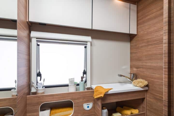 Ob im Heck‐Doppelbett, im Alkoven-Bett oder im Umbau-Bett der Dinette: Im CaraHome schläft man immer wie auf Wolken. Dafür sorgen die hochwertigen Kaltschaummatratzen (nicht im Dinettenbett) ebenso wie die gemütliche Wand‐ und Deckenverkleidung. Des Weiteren ist der CaraHome mit einem Premium-Raumbad mit seperater Duschekabine, Toilette und Waschbecken ausgestattet.